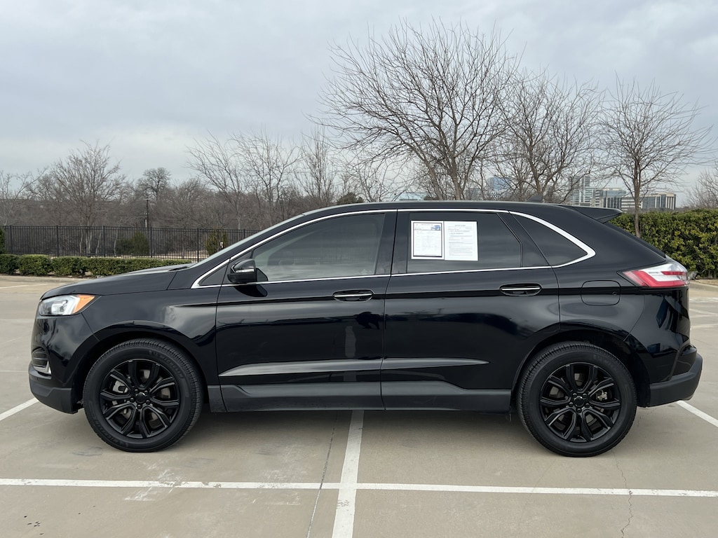 Black Metallic 2022 Ford Edge Titanium AWD 8-Speed Automatic EcoBoost 2.0L I4 GTDi DOHC Turbocharged VCT Edge Titanium, 4D Sport Utility, EcoBoost 2.0L I4 GTDi DOHC Turbocharged VCT, 8-Speed Automatic, AWD, Black Metallic, Ebony Leather, 12 Speakers, 3.80 Axle Ratio, 4-Wheel Disc Brakes, ABS brakes, Air Conditioning, Alloy wheels, AM/FM radio: SiriusXM with 360L, Auto High-beam Headlights, Auto-dimming Rear-View mirror, Automatic temperature control, Brake assist, Bumpers: body-color, Compass, Delay-off headlights, Driver door bin, Driver vanity mirror, Dual front impact airbags, Dual front side impact airbags, Electronic Stability Control, Emergency communication system: SYNC 4 911 Assist, Engine Block Heater, Equipment Group 300A, FordPass Connect, Four wheel independent suspension, Front anti-roll bar, Front Bucket Seats, Front Center Armrest w/Storage, Front dual zone A/C, Front fog lights, Front reading lights, Fully automatic headlights, Garage door transmitter, Heated door mirrors, Heated front seats, Heated steering wheel, Illuminated entry, Knee airbag, Leather-Trimmed Heated Sport Bucket Seats, Low tire pressure warning, Memory seat, Occupant sensing airbag, Outside temperature display, Overhead airbag, Overhead console, Panic alarm, Passenger door bin, Passenger vanity mirror, Power door mirrors, Power driver seat, Power Liftgate, Power passenger seat, Power steering, Power windows, Radio: B&O Sound System by Bang & Olufsen, Rain sensing wipers, Rear anti-roll bar, Rear reading lights, Rear seat center armrest, Rear window defroster, Rear window wiper, Remote keyless entry, Security system, SiriusXM w/360L, Speed control, Speed-Sensitive Wipers, Split folding rear seat, Spoiler, Steering wheel mounted audio controls, SYNC 4A w/Enhanced Voice Recognition, Tachometer, Telescoping steering wheel, Tilt steering wheel, Traction control, Trip computer, Turn signal indicator mirrors, Variably intermittent wipers, Wheels: 19 Luster Nickel-Painted Aluminum.21/28 City/Highway MPG