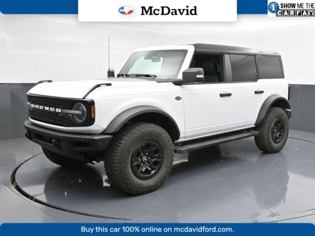 CARFAX One-Owner. Clean CARFAX. Oxford White 2024 Ford Bronco Wildtrak 4WD 10-Speed Automatic 2.7L EcoBoost V6 10 Speakers w/Subwoofer, 360-Degree Camera, Adaptive Cruise Control, Additional Sound Deadening, Equipment Group 354A High/Lux Package, Evasive Steering Assist, Front Parking Sensors, Heated Steering Wheel, Information on Demand Panel, Radio: B&O Sound System by Bang & Olufsen, Sideview Mirrors, Universal Garage Door Opener, Wireless Charging Pad.Used 2024 FordBronco Wildtrak SUV V-6 cyl